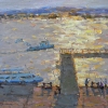 This painting enchants with light, color and transparency of the air over the Volga expanse. From a bird's eye view, the artist shows the river terminal area, where a long pier, many moored vessels and a small group of fishermen located on the very ledge of the pier are clearly visible. The main character of the composition is the river itself, sparkling with thousands of reflections under the sunset or morning sun; gentle pink, lemon and lavender strokes play on the surface of the water and give it a rich, warm liveliness. The grandeur of the Volga is balanced here by the simple everyday life of fishermen, thoughtfully peering at their fishing rods, a passing boat and rhythmically located buildings along the shore. There is also a sense of subtle urban bustle - boats go about their business, and people on the pier are busy with a simple, eternal task. The artist accurately and subtly conveys the atmosphere of fresh water, a bright day and a slight hope for good luck. This canvas is a hymn to the simple beauty and liveliness of river banks, to the meditative contemplation of a great river on an ordinary day.