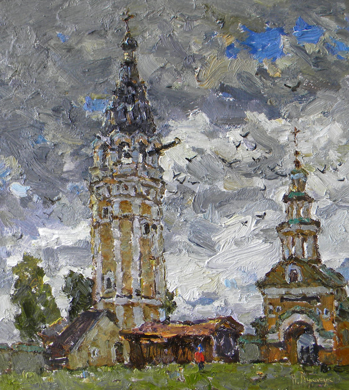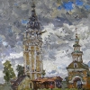 The painting "Bell Tower of the Resurrection Cathedral" takes the viewer to the foot of a majestic Orthodox church, clothed in solemn silence under a heavy sky. Before us is a strict, vertically directed bell tower, with the plasticity of forms and cozy muted colors typical of old Russian architecture. The image seems to be permeated with a slight nostalgia: massive walls, every crack and brushstroke are evidence of time, reverent care and many years of tradition. Near the foot rises a modest church building, and on the right is another dome with a cross, which emphasizes the complexity of the ensemble. The clouds scattering across the sky are painted with loose impasto brushstrokes and create a sense of movement and changeable weather - it seems that at any moment a thunderstorm can break out over the cathedral or, on the contrary, the sun can come out. Muted green, blue, gray, ochre tones accurately and deeply convey the atmosphere of a real old Russian province. In the distance, barely distinguishable, silhouettes of people flicker, which only enhances the feeling of silence and eternity that fill this scene. The bell tower, like a sentry over the city, is a symbol of spiritual support, gathering people around itself for many generations. The work evokes respect for history, a sense of stability and involvement in the inexhaustible spiritual depths of our culture.