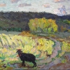 The painting "The Black Ram" is a picturesque reflection on nature, loneliness and the quiet harmony of rural landscapes. In the foreground is the figure of a large dark ram, confidently standing on a path among the grasses flooded with yellow light. Its thick fur, expressive silhouette, alert ears - all this is painted deeply and plastically, masterfully generalized, devoid of unnecessary detail. The ram stands out against the background of a bright, multi-grass meadow, where green and golden shades are given with light strokes. In the distance, beyond the forest strip, there is a dark forest, over which clouds rise - the sky is transparent, open, as if filled with the early sun.