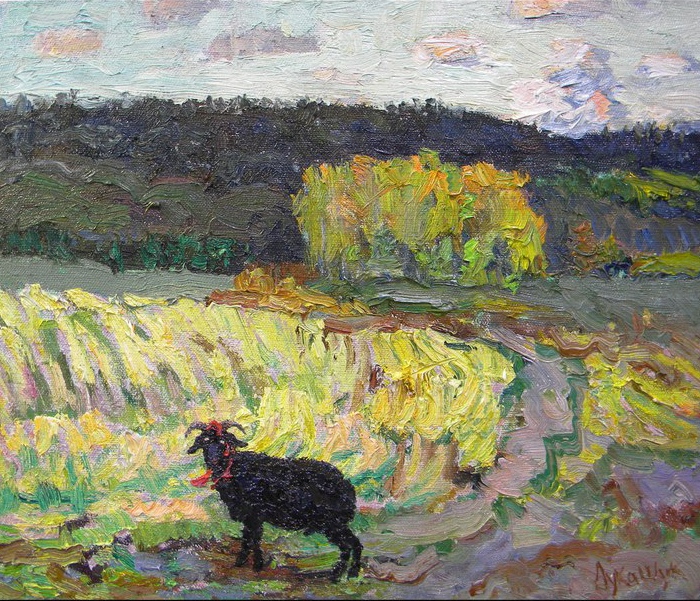 The artwork is made during all-russian plein air "Plastov's automn." in 2016. The Assembly of artists takes place each year in the village "Prislonikha" of the Ulyanovsk's region which is homeland of famous soviet artist Arkady Plastov. As the artist told, he intended to paint just the landscape but suddenly the black ram appeared. The aritist was impressed with appearance of the ram. It was absolutely black ram with bright red ribbon on the neck.