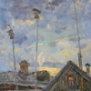 "The Birdhouses" is a surprisingly touching and poetic urban or rural motif, which contains several meanings at once. The central place on the canvas is occupied by the roof of an old house, and high above it rise thin poles with birdhouses, like man-made beacons for birds returning in the spring. The sky is painted in soft, disturbing, but light shades - gray-blue, with glimpses of sunset or sunrise. The atmosphere itself suggests anticipation: a trill is about to be heard, and the dwelling, carefully prepared for the starlings, will be filled with life and noise. The birdhouses here are a sign of the kindness of the residents, the beauty of simple and warm human actions. The artist emphasizes the verticals: poles and birdhouses pierce the sky, and the roof with a small warm window brings coziness and peace to the composition. This work is a meditation on returning home, on natural cyclicality, on the ability to see magic in the modest details of each day