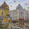 The painting "Samara Philharmonic" is an example of the urban genre, in which the artist puts deep respect for the architecture and historical memory of the city. The focus is on the majestic building of the Philharmonic, its white-stone walls and graceful dome. In front of the building, sunlight plays, reflecting in puddles and on wet asphalt - it has obviously rained recently. The old yellow house on the left emphasizes the contrast of eras, gives the landscape coziness, enhances the feeling of continuity of the urban environment. The wires above the street, trams, cars and rare passers-by complement the atmosphere of a capital, but at the same time homely city. Particular attention is paid to the transmission of light and color: the artist skillfully works with ochre, slate and milky-blue tones, creating a mood of cool, clean air. The painting calls for a leisurely stroll along the streets of Samara, for a close look at the buildings familiar from childhood. This is not just an architectural portrait, but a living memory of cultural life, meetings, concerts and evenings filled with music.