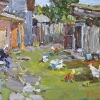 In the painting "Prislonikha Yard" the artist reveals to the viewer the authentic atmosphere of a provincial Russian village, where there is harmony between man and nature, respect for traditions and a leisurely pace of life. The spacious yard is surrounded by wooden buildings of different centuries and conditions: here are old huts with colored gables, and slanted fences, and utility sheds under the shade of large trees. Chickens are walking in the yard, old buckets are scattered around, a dusty road stretches to the house. You can see the figure of a woman busy with her own affairs, children with a ball or a bicycle, and somewhere along the fence - a dog on a leash. Everything breathes the present: the smell of grass, the cries of birds, the sun burnt out on the wooden walls. The main motive of the work is the sustainability of life, timelessness, how a village yard can become the center of the world for the whole family. The details contain the memory of generations, a tender attitude towards the small homeland, respect for the land and its simple joys.