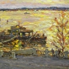 The painting invites the viewer to the observation deck of the Volga embankment at the hour when the river is shrouded in the last rays of the sun. The space is endowed with a special light - golden, pinkish: this is how the Volga looks at sunset. On the embankment you can see openwork fences, figures of people - someone is going down to the water, someone is lingering in conversation. In the distance - boats and motorboats, slightly unclear, as if dissolved in golden reflections. The artist carefully built the composition, focusing attention on both the foreground and the background: warm wood, reflections in the water, ripples on the surface of the river. This is not just a city landscape, but a place inspired by the elements, where the evening gives peace, tranquility and a slight sadness. The landscape gives birth to dreams, makes you stop and think about the beauty of simple things, about the greatness of the river and about time, which slows down at sunset.