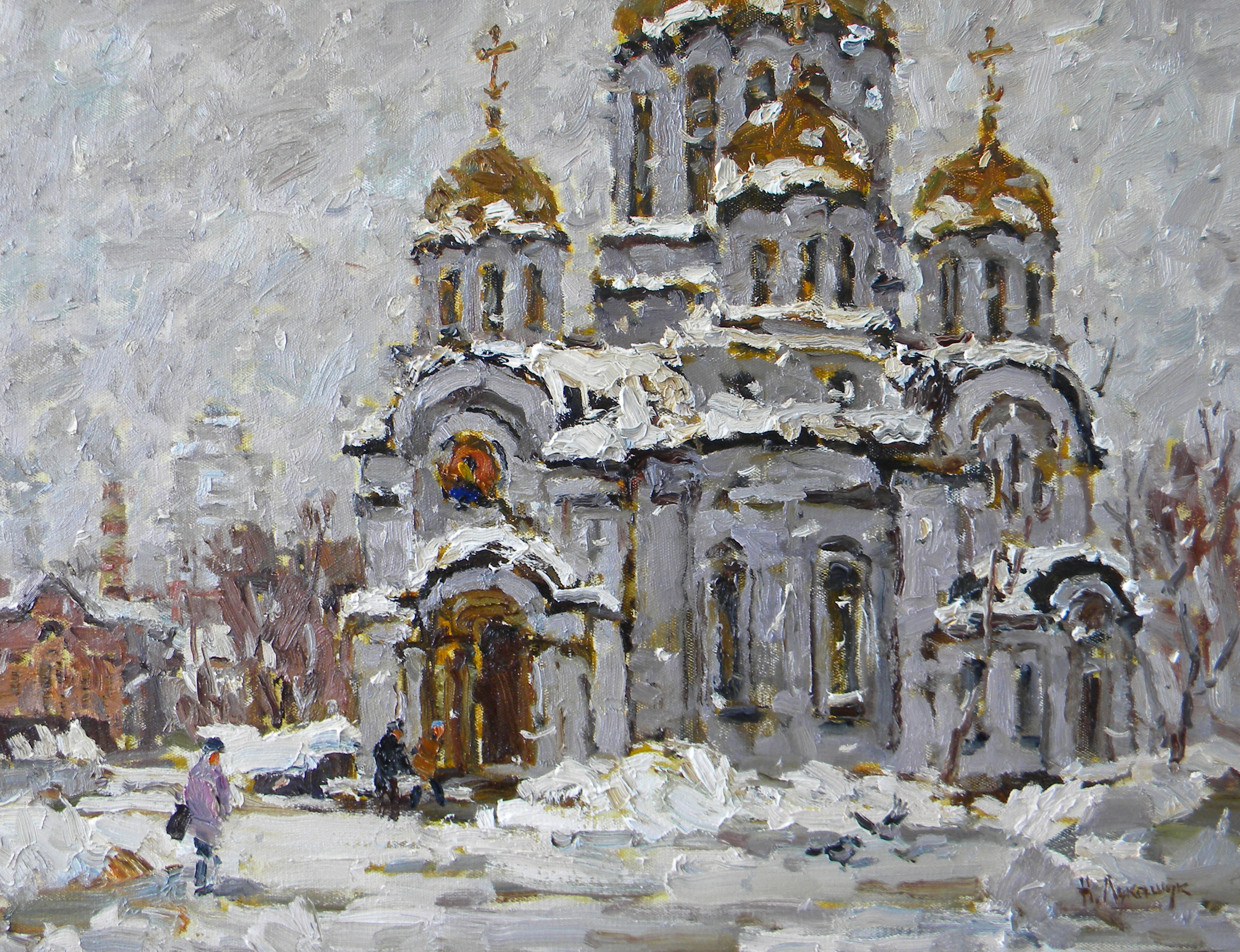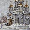 The majestic urban winter landscape is mesmerizing. In the foreground is the elegant Church of St. George the Victorious with royal domes and snow-white walls. Winter snow has wrapped everything around in clean, sparkling clothes. The architecture of the cathedral is strict and solemn, exquisitely painted columns, arched windows, delicately worked out decorative details. A lonely passerby approaches the temple slightly timidly, another person lingers at the entrance: all this sudden feeling of life, in which religion remains the center of attraction. The gray-blue sky with barely noticeable brushstrokes gives the whole composition airiness and lightness. Nature and the temple are in dialogue: the music of the bells dissolves in the frosty air, the atmosphere of silence, the expectation of Christmas or Epiphany. In this work there is genuine love for the Russian winter, the city and spiritual heritage. A harmonious inner picture, I invite you to think about the eternal and bright.
