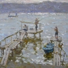 This work subtly feels the freshness of the morning by the water. Fishermen are standing on wooden bridges stretching into the river - some are just casting their lines, others are already waiting for a bite. Bluish and gray tones create the mood of early daylight - it has just dawned, a light haze still hangs in the air. The first rays of the sun shimmer on the water, boats crackle near the shore and, it seems, you can even hear the roar of a morning bird. In the distance - flocks of seagulls, boats planning a new working day. The painting breathes silence, hope and calm - only morning by a large river can be like this.