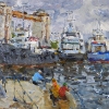 This work immerses the viewer in the world of a river station, full of life and movement. In the foreground, people are fishing, their figures painted with a broad, energetic brushstroke. Bright splashes of color on their clothes highlight the characters against the background of water and ships. Behind them are massive ships, a pier structure, and cranes. The atmosphere is filled with the light noise of the port and the splash of waves, and white seagulls flicker above all this. Vague, slightly blurred contours convey the humidity and mobility of the air. The composition is constructed so that the gaze slides from the fishermen to the ships and further, to the sky.