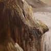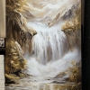 Delicate splashes, splashes, thin streams - each element is drawn with love, creating not only a visual but also a tactile effect. The arch of mountains and clouds above enhance the dynamics of the entire scene. The color palette is maintained in warm golden, white and coffee tones, which adds sophistication and a sense of privacy to the work.