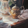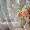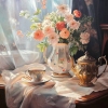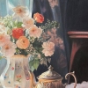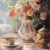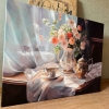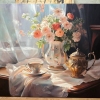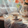 This realistic still life, executed on a soft pink napkin, captures the beauty of a porcelain vase with exquisite roses in beige and pink shades. The cup and saucer, as well as the milk jug, placed side by side, create a sense of morning tranquility, while the transparent tulle on the window adds a touch of lightness and airiness.