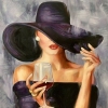 In her hand, the woman holds a glass of red wine, which reflects the reflections of the surrounding light. The second hand lightly touches the brim of the hat - an elegant gesture that emphasizes lightness, freedom, confidence. White earrings and light skin contrast with a black dress and a background consisting of soft smoky strokes. This combination emphasizes the sophistication and attractiveness of the heroine.