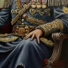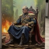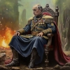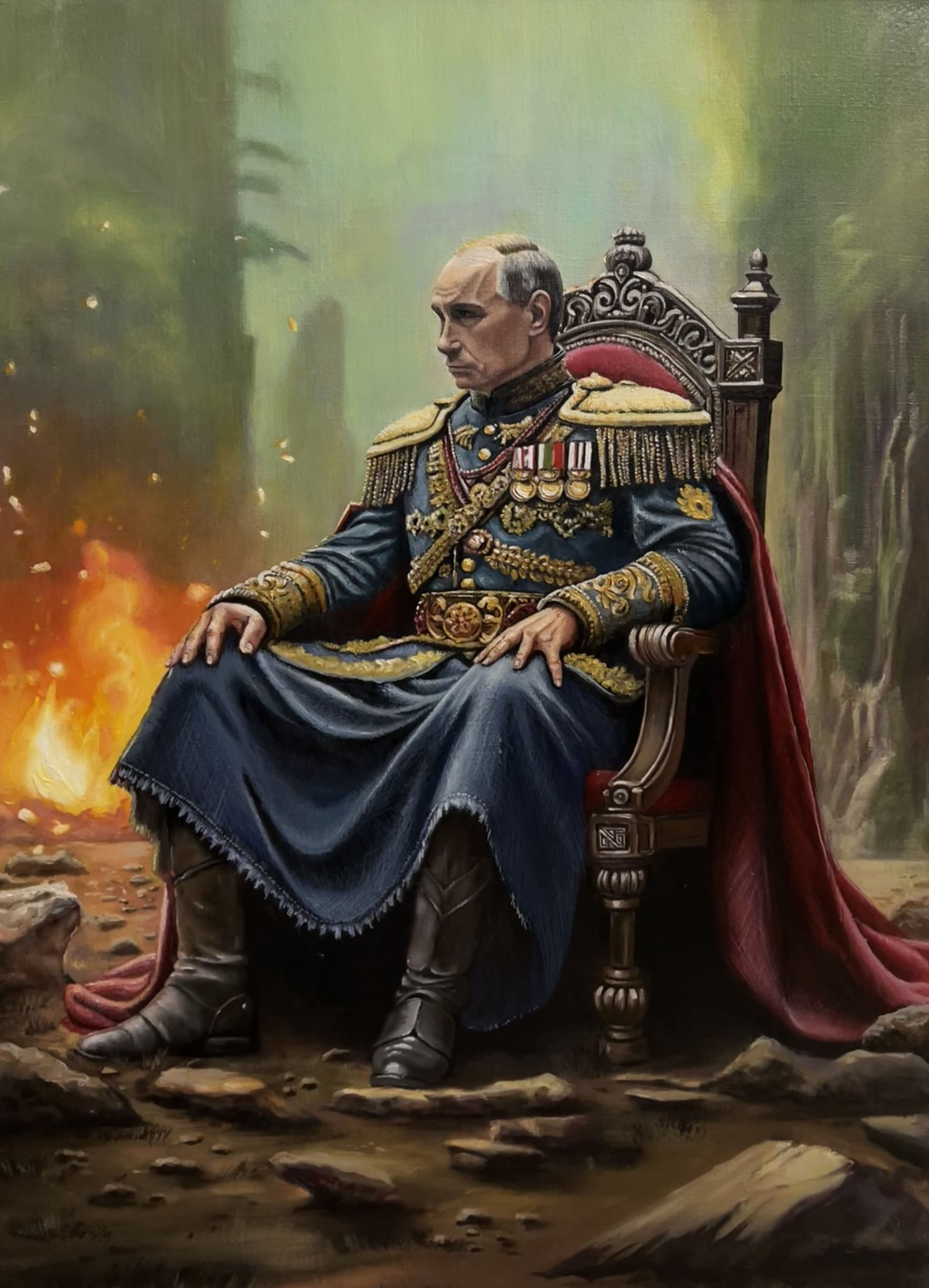 The painting "The Flame of Power in the Shadow of the Campfire" amazes the viewer with its deep philosophical content and non-trivial approach to the embodiment of the theme of power, loneliness and inner strength. The composition focuses on the figure of a man in a ceremonial military uniform, sitting on a massive carved throne right under the open sky, near a dimly blazing fire. His gaze is directed somewhere into the distance, into the shadow of the past or thoughts about the unknown future. The artist introduces elements of historicism and symbolism: shoulder straps, orders, detailed decorations on the military uniform emphasize the status and the burden of responsibility lying on the shoulders of the hero.