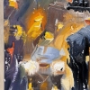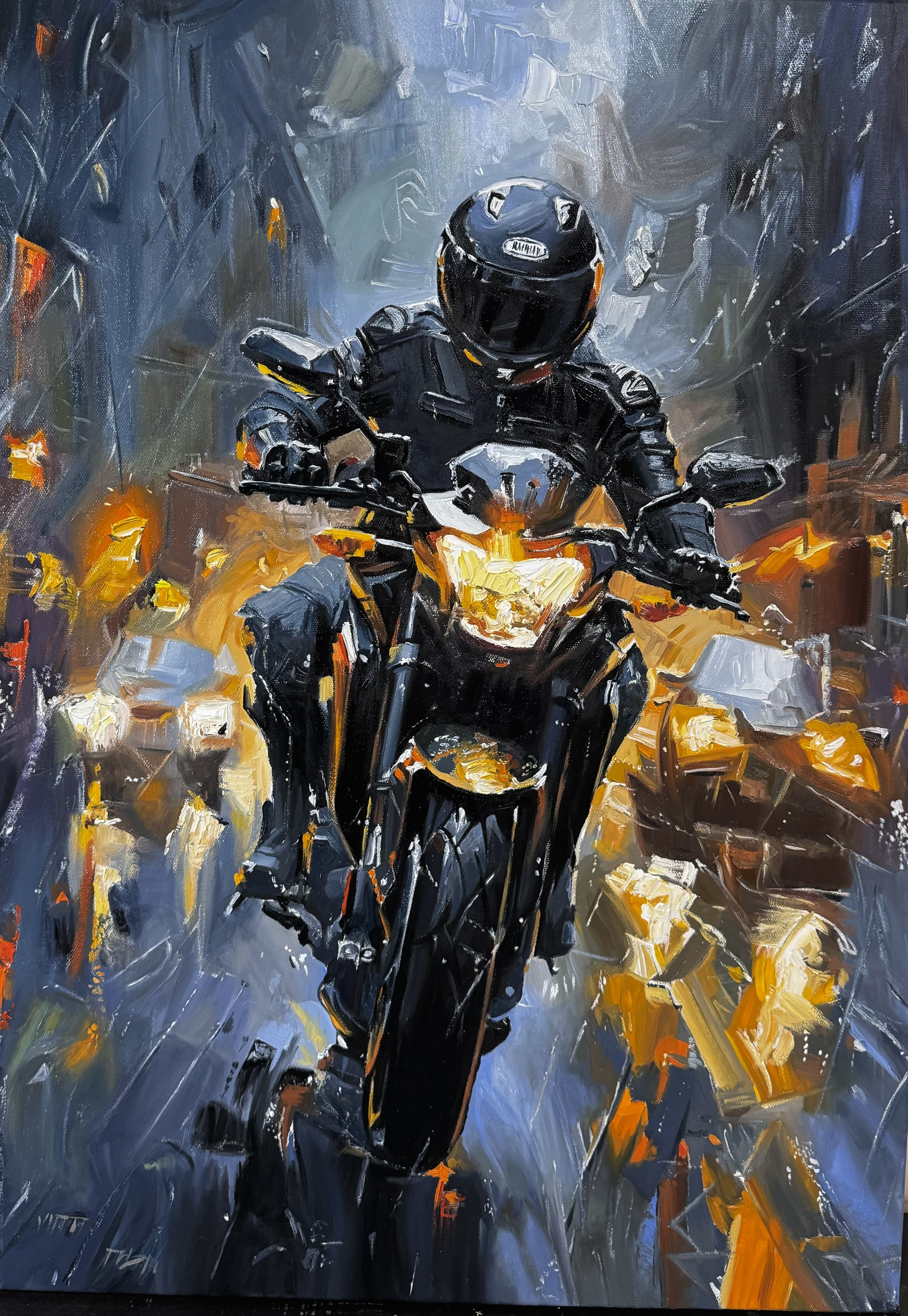 The canvas "Headlights and Adrenaline" is an ode to the night city, crazy speed and thrills. The canvas is dominated by the masculine silhouette of a motorcyclist in black gear, rushing towards the viewer through the play of lights and the reflections of the asphalt, soaked in fresh rain. The bright headlight is the center of visual attraction, inside it is a real fire of movement, life, excitement. With the help of texture paste, the artist gives the scene a physical tangibility: the brushstrokes are thick, as if they themselves cut the cool night air. The background is not just streets: it is an abstraction of emotions, flashes of streetlights blurring in the evening haze. This approach emphasizes the main motive - to merge with the road, to forget about everything except speed and thirst for thrills. There is no peace here, every movement of the brush is an explosion of energy, an internal struggle between fear and adrenaline. The canvas literally charges with drive and reminds of the magic of night adventures at the limits of human capabilities.