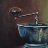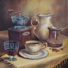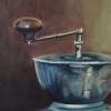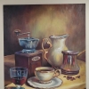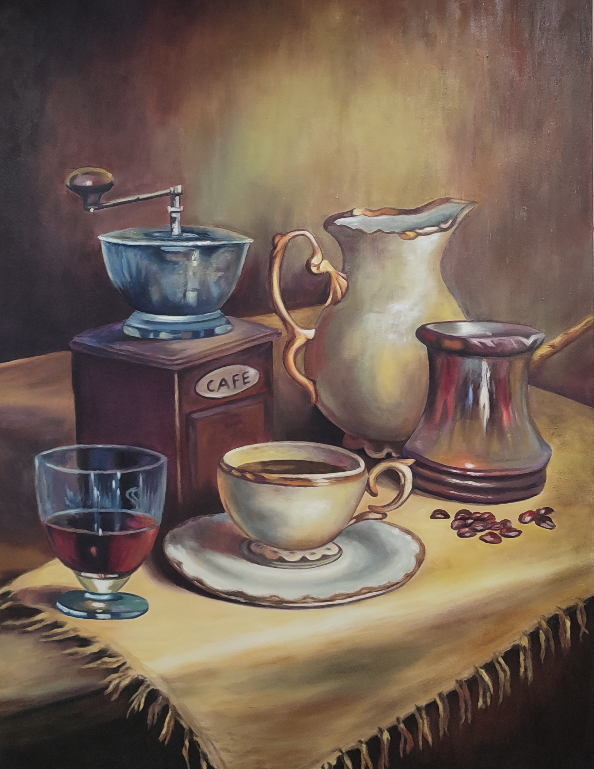 This painting is a hymn to the secluded tranquility of a traditional morning. The rich canvas in warm coffee and golden shades depicts a still life with a retro coffee grinder, an elegant cup of coffee on a saucer, an antique jug, a copper Turk, a glass and coffee beans. The objects are harmoniously arranged on the tablecloth, and the diffused soft light emphasizes their volume, texture and nobility. The author's technique gives the objects a gentle glow - we can almost smell freshly ground coffee and hear the light clink of dishes. The work sets a philosophical mood, inviting you to slow down, think and allow yourself moments of true peace and meditation over a cup of your favorite drink. The painting is perfect for a kitchen, cafe, living room, giving the interior warmth and coziness.