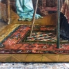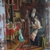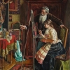 The color palette of the painting is warm and muted. Soft light, penetrating the workshop, focuses attention on the faces of the teacher and student, creating a sense of peace and concentration.