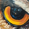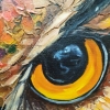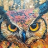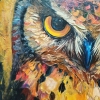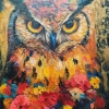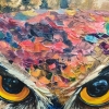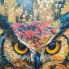 At the center of attention is a majestic owl, its piercing gaze penetrating directly into the soul of the viewer. Bright, saturated colors of plumage, executed in the impasto technique, create a sense of volume and liveliness. It seems as if the owl is about to flap its wings and fly into the night sky.