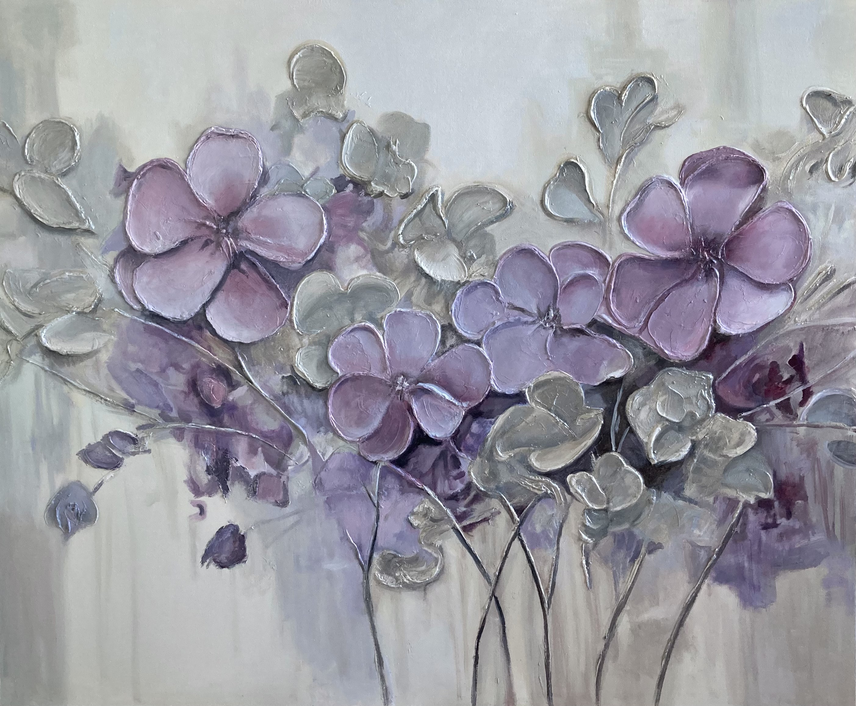 Vera Basova’s painting “Purple Flower Dreams” is a gentle and refined reflection on the beauty of nature, executed in a muted, almost monochrome palette. Cool lilac and silver hues create an atmosphere of tranquility, dreaminess, and light melancholy.