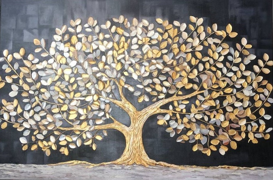 At the center of attention of the painting is a tree with a lush crown, выполненная in gold and silver tones. Its branches seem to be a symbol of wealth, prosperity, and material well-being. The artist skillfully conveys the texture of the leaves, their roughness and shimmer, creating a sense of realism and presence. The tree seems to be a living being, filled with energy, growth, and prosperity.
