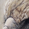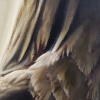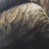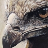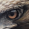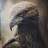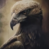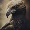 The painting’s background is deliberately darkened and blurred, executed in soft, earthy tones (brown and olive). This understated background serves to bring the figure of the eagle to the forefront, focusing the viewer’s attention solely on its head and gaze. The absence of distracting details enhances the monumentality and concentrated essence of the image.