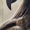 The artist masterfully conveys the texture of the plumage. The detailed rendering of the feathers on the head and neck, achieved with delicate brushstrokes in browns, ochres, and dark grays, lends the image incredible vitality and volume. One can almost feel the stiffness and smoothness of the feathers. The powerful, curved beak underscores the bird’s predatory nature and its capacity for action.