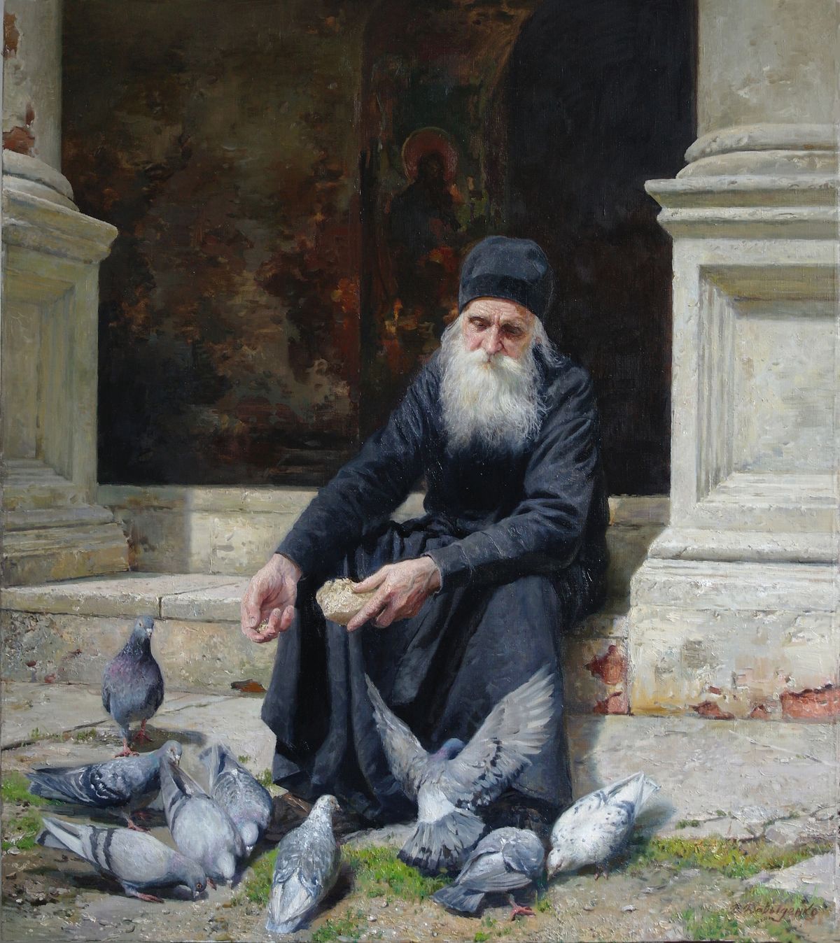 A special feature of the painting is the image of doves surrounding the elder. They seem to be a symbol of peace, purity, and divine grace. Doves trustingly pecking crumbs from the elder’s hands create a feeling of harmony and unity of man with nature, and also emphasize his kindness and mercy. The old man is holding a piece of bread in his hand.