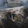 Above the trench, looming like a symbol of death, rises a German tank. Its formidable appearance, emphasized by smoke and soot, creates a feeling of strength and power, before which man seems defenseless and vulnerable. There were hundreds of thousands of such soldiers in those days, in the trenches.