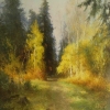 This picturesque painting conveys the enchanting atmosphere of an autumn forest. The artist masterfully uses warm golden and deep green tones to depict the natural landscape. The central place is occupied by a narrow path leading deep into the forest, surrounded by tall firs and dazzling yellow birches. The sun's rays gently penetrate the foliage, creating a play of light and shadow, which gives the painting a special depth and volume. This work of art gives a feeling of coziness, peace and silence of an autumn day.