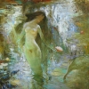 This painting depicts a mystical and enigmatic scene in which a naked female figure, reminiscent of a mermaid or water nymph, emerges from a mysterious body of water. Her body seems to merge with the surrounding environment, creating a sense of ephemerality and magic. In one hand, she holds a delicate flower, symbolizing the connection with nature and the fragility of the moment.