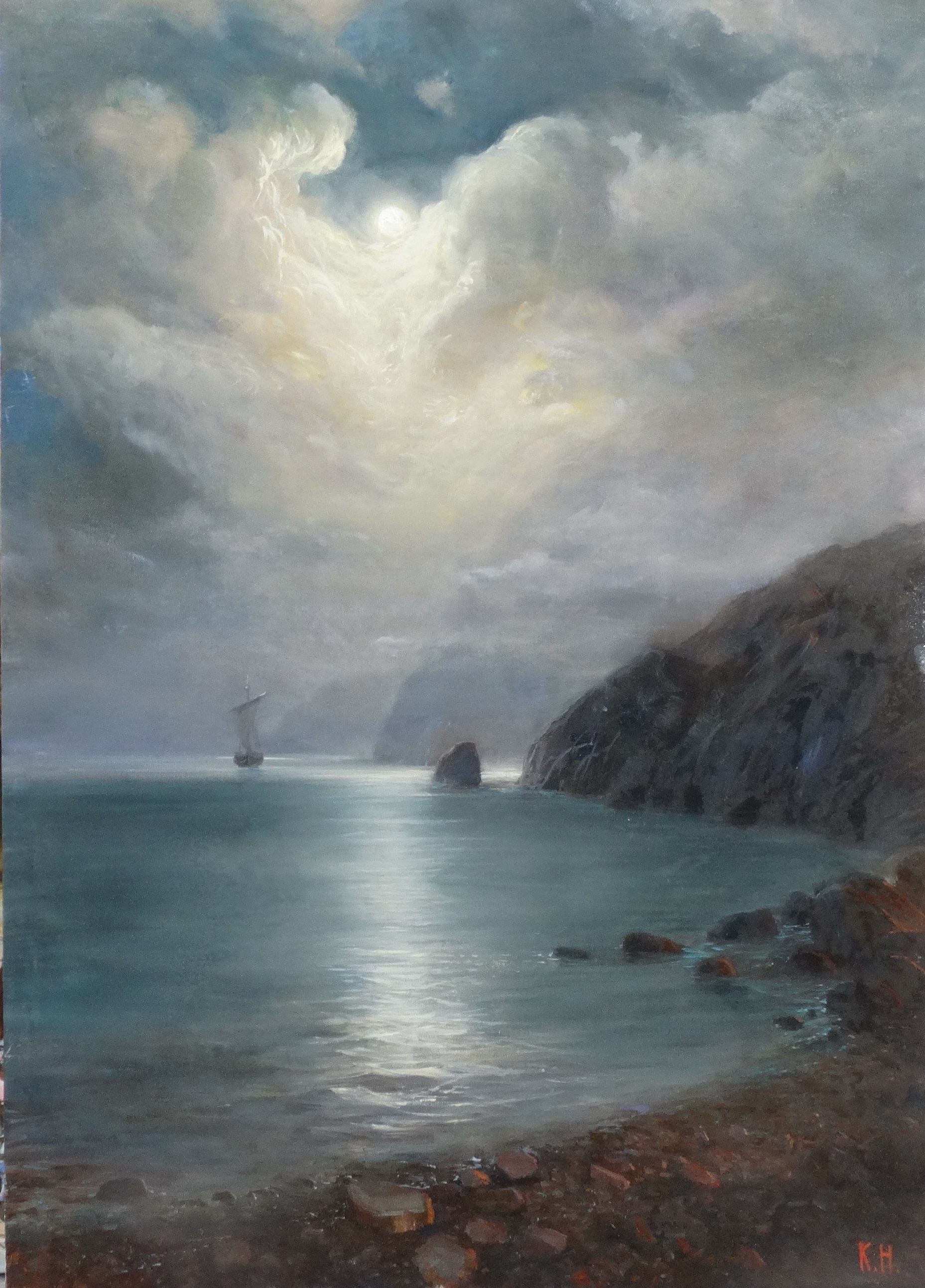 The painting depicts a seascape immersed in an atmosphere of mystery and tranquility. The moon breaks through thick clouds, illuminating the water surface with a soft glow. The moonlight is reflected on the surface of the sea, creating the effect of a shimmering path that goes deep into the composition.