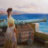 The painting titled "Hope" depicts a young woman standing by ancient cannons on the seashore. Her gaze is directed towards the endless waters, as if she is eagerly awaiting the return of someone dear.