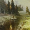 The painting depicts a picturesque landscape with a river surrounded by a dense coniferous forest. The quiet surface of the water reflects the trees and the sky, creating an atmosphere of calm and tranquility. A light fog can be seen in the distance, giving the painting softness and mystery. In the center of the composition is a small raft, on which two figures stand - a man and, perhaps, his companion. They seem to enjoy the unity with nature. The painting is done in warm, natural tones, conveying the charm of Russian nature, its silence and harmony.