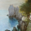 The painting depicts a picturesque coastal landscape. The viewer is presented with a view of a rocky shore washed by calm azure waters. Massive cliffs rise above the sea, creating a majestic atmosphere. On the right, architectural elements are noticeable - a balustrade and a staircase descending to the water, which give the composition a romantic mood. The crowns of the trees create a soft shadow, and the distant horizon is shrouded in a light haze. The painting conveys the peace and harmony of nature, evoking a feeling of calm and beauty of the sea coast.