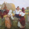 The painting "From Childhood" conveys the warm atmosphere of village life, filled with joy and hard work. The artist masterfully depicts a harvest scene on a summer day, where a group of women in traditional folk costumes are busy working, communicating with each other. In the center of the composition is a smiling woman, creating a sense of friendliness and love of life. Next to her are girls and children, which adds a special warmth to the painting. In the background, you can see a boy sitting on a horse in front of a huge haystack, which emphasizes the rural way of life.