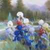 The painting "In the park" is a beautiful painting that conveys an atmosphere of coziness and natural harmony. In the center of the composition is a blooming garden with bright irises of all sorts of shades - from deep blue and purple to delicate white and gold.