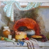 The painting depicts a cozy village still life with a Russian stove in the center of the composition. The fiery red dome of the stove gives the scene warmth and realism, creating a feeling of home comfort. In the foreground are traditional culinary products - fresh bread, pie, clay pot with milk, green onions, eggs and various spices. Multicolored cornflowers add picturesqueness, and a checkered towel, casually hanging from above, emphasizes the atmosphere of simple village life. The painting is done in warm, soft tones, conveying a sense of hospitality and nostalgia for a traditional Russian home.