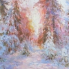 This painting is done in the impressionist style and depicts a winter forest, enveloped in the soft light of sunset or sunrise. The artist masterfully conveys the atmosphere of silence and fairytale with the help of a combination of warm and cold shades. White snow covers the branches of trees, and soft rays of the sun penetrate through the thick needles, painting the landscape with purple, pink and golden highlights. The painting is filled with lightness and dynamics thanks to free brushstrokes, which makes the image lively and expressive. It evokes a feeling of coziness and admiration for the beauty of winter nature.