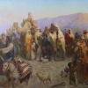 In the foreground, you can see Moses leading his people through the desert lands. Around him, people of different ages - from children to elders - carry belongings, lead cattle and pray. The depth of the composition, detailed drawing of the clothes and faces of the heroes, as well as warm earthy tones create a sense of historical authenticity and the grandeur of the moment.