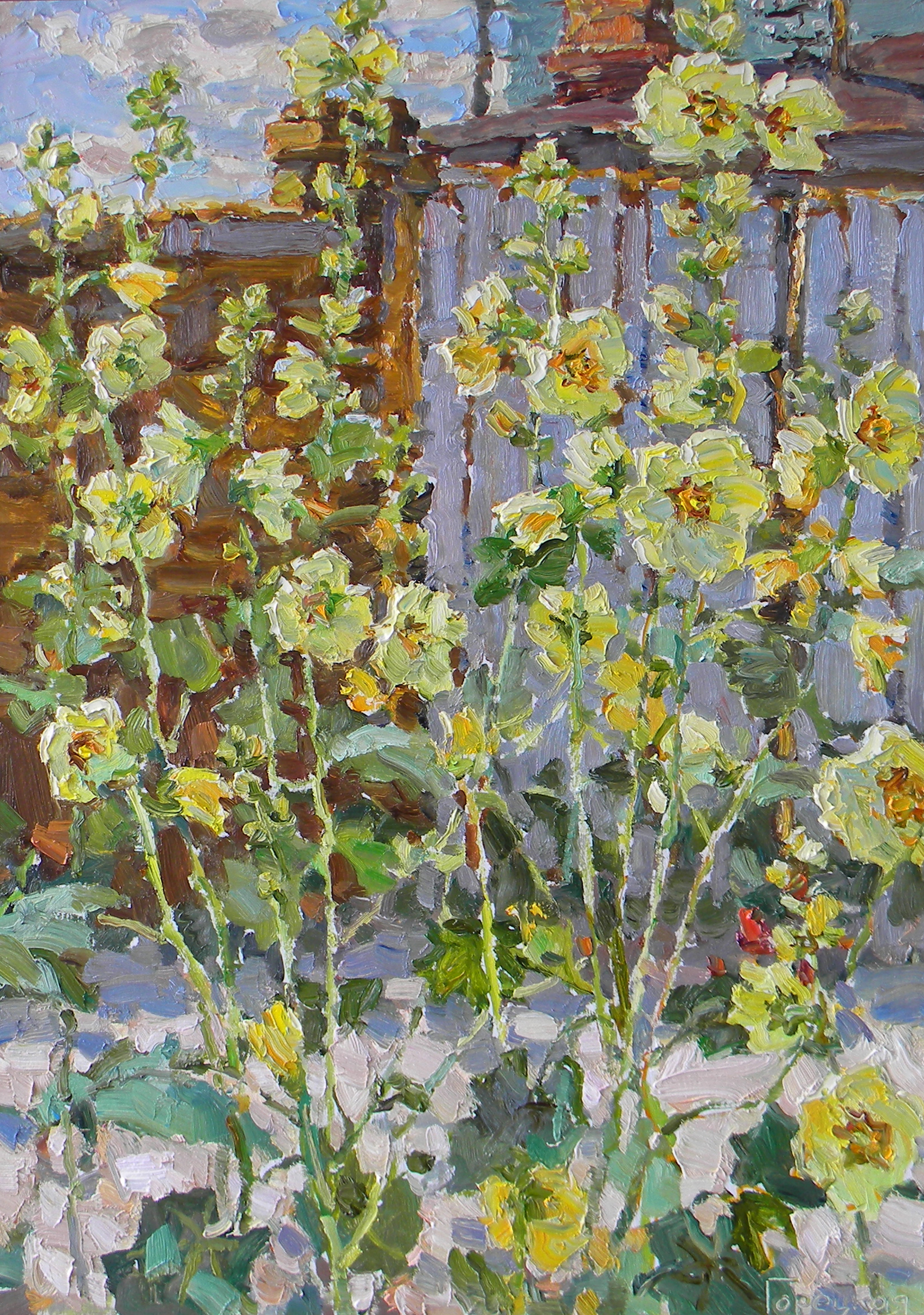 This original artwork “The Yellow Hollyhocks” was created by the contemporary Russian artist Polina Goretskaya and is available for sale online.