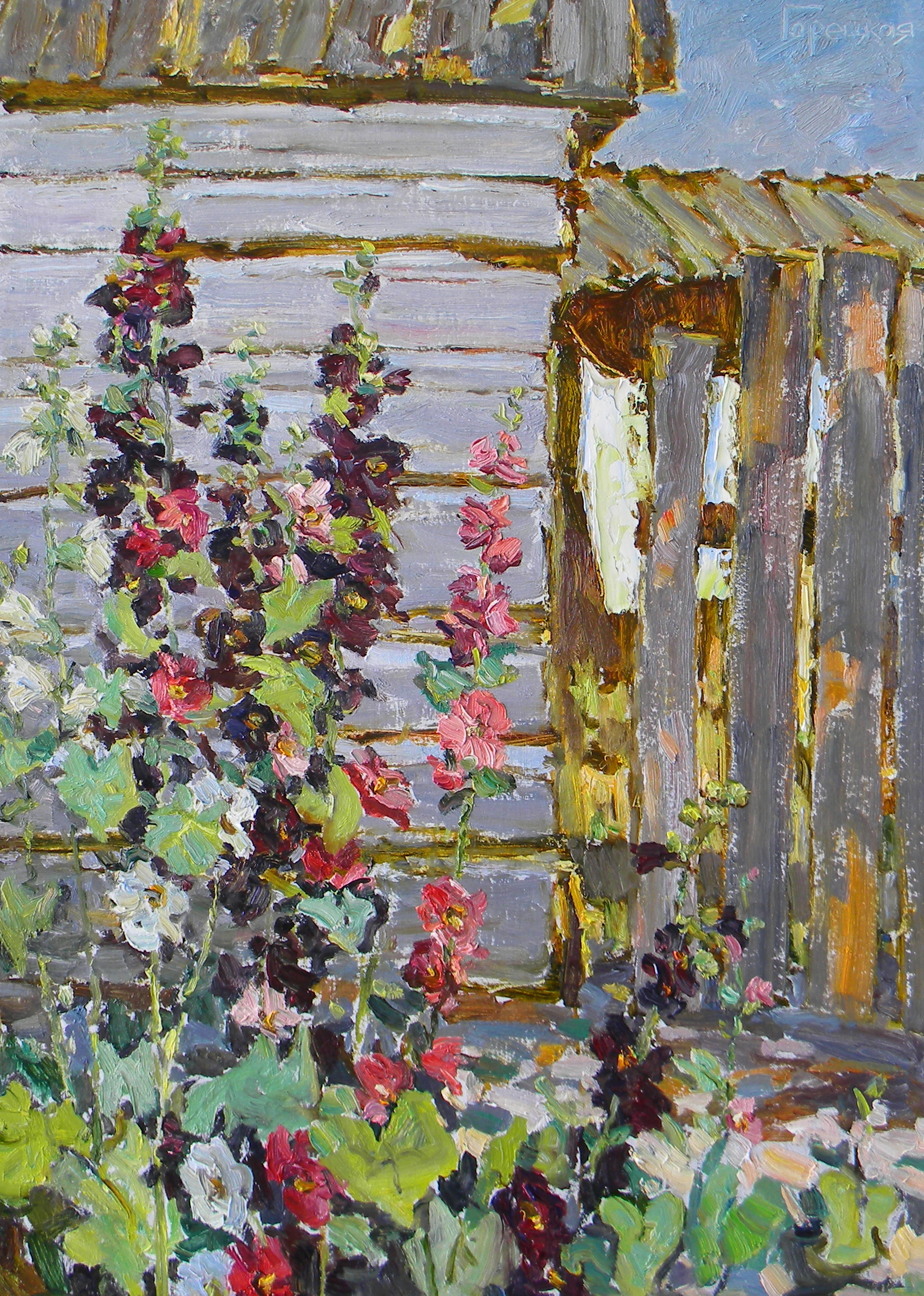 This original artwork “Fences and Hollyhocks in the Village of Rozhdestveno” was created by the contemporary Russian artist Polina Goretskaya and is available for sale online.