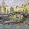 The spring's evening in Saints Petersburg is quiet and clear. The last traces of icy winter are fading away. The river now is dark and alive and it shines with lights of illumination. The lamps are igniting one after another like the pearls full of golden, warm and calling invisible threads. The air is very wet and fresh and it smells with breath of Baltic Sea. The facades of palaces, once gray from the winter cold, now seem softer. Their gray walls are more gentle and are illuminated by twilight. At the embankment the people are walking and watching at water and fires in it. Above the city there is broad sky. It is still light pale blue nearby the horizons. When we look higher in artwork, the sky turns more blue and full of depth. The spring Saints Petersburg is magnificent right now in this moment when the winter faded away and the summer did not come yet - in the moment of balance, silence and waiting.