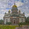 The Isaakievsky Catherdal is one of the most famous and grand temples of Saints Petersburg. Its construction lasted from 1818 to 1858 as the part of Auguste Montferrand's architectural project. The cathedral is dedicated to Saint Isaac of Dalmatia, the patron saint of Peter I. The building impresses with its size: the height is 101.5 meters, and the diameter of the dome is 26 meters. Inside of catherdal there are mosaics, paintings and sculptures, as well as columns made of malachite and lapis lazuli. The dome is covered by gold-plated plates, it took about 100 kilograms of gold to make it. The catherdal can be filled by 14 000 men and women at one time. During the era of USSR, the temple was turned into museum of atheism but now it once more operates as orthodox catherdal and museum. The watching platform in column openes panoramic view at the center of city. The Isaakievsky Catherdal is one of symbols of Saints Petersburg and Unesco Heritage Sight. The artist has empahized sophisticated sky. It is unusually for Saints Petersburg bright blue with frisky clouds. It is in balance with solemn architecture.