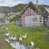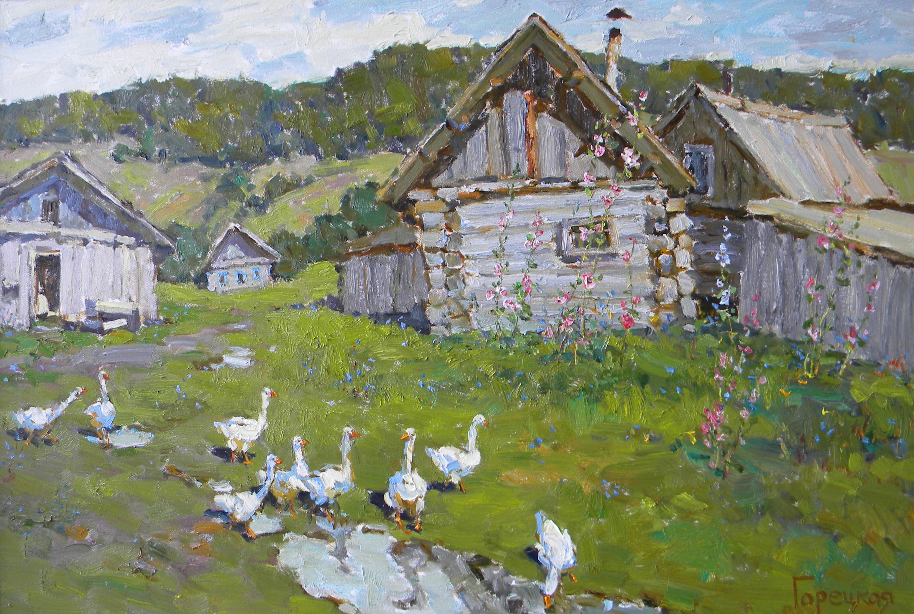 Polina Goretskaya’s painting “The White Geese” is a bright and joyful landscape imbued with love for the Russian countryside and its inhabitants. In contrast to complex genre scenes and multi-figure compositions, in this work the artist turns to a simple and sincere motif - the depiction of rural life, its everyday life, and joys.