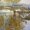 At the center of attention of the painting is the water area of the yacht club, filled with boats and yachts. Their white hulls, reflected in the water, create a sense of movement and dynamics. The artist masterfully conveys the play of light and shadow on the surface of the water, using various shades of blue, green, and yellow to create a feeling of depth and transparency.