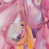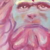 At the center of attention is a face framed by something resembling a lion’s mane or flower petals, executed in bright pink and lilac tones. The face itself, depicted in cooler, bluish shades, appears somewhat detached and mysterious. The gaze, directed straight at the viewer, expresses willpower, confidence, and perhaps even a hint of sadness.
