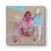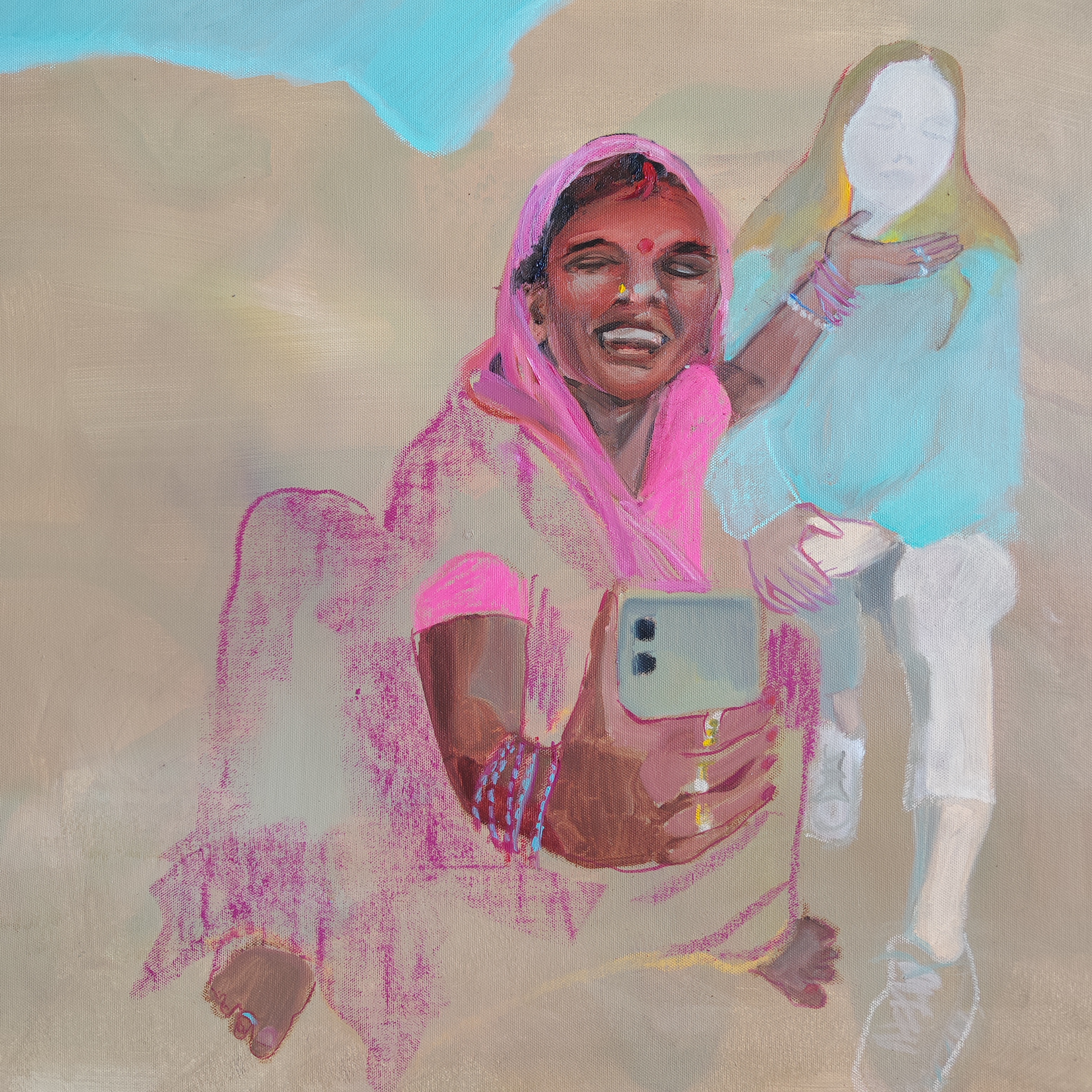 The focus of the painting is the figure of a woman sitting on the ground. Her attire, executed in bright pink and ochre tones, immediately gives away her belonging to Indian culture. A broad smile shines on her face, expressing sincere joy and enthusiasm. She holds a modern smartphone in her hands, which creates an interesting contrast between traditional appearance and technological progress.