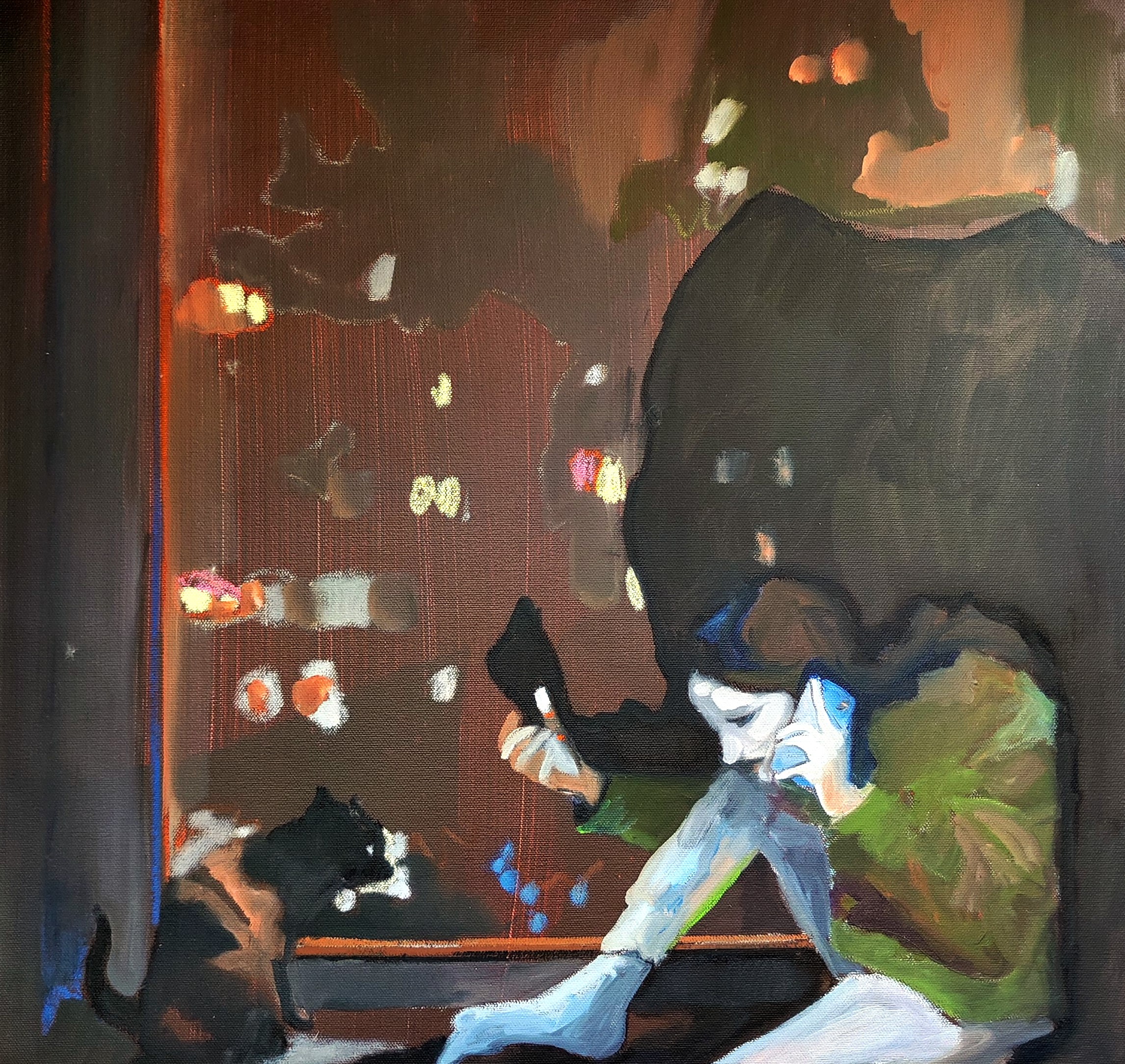 The composition of the painting is built around a figure sitting on a windowsill in a dark room. The figure’s posture, hunched and thoughtful, expresses alienation and sadness. The figure’s face, hidden in the gloom, betrays a state of inner concentration and distress. In their hand is a phone, like a link to the outside world, but seemingly bringing no comfort.