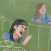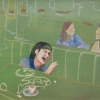 Nadya Prades’ painting “Gossip” is a bright and dynamic sketch from life, capturing a moment of lively exchange of information, often called gossip or friendly discussion. The artist uses a bold, almost neon green palette and simplified, contour forms to convey the energy of the conversation, the secrecy of the moment, and the emotional involvement of the participants.