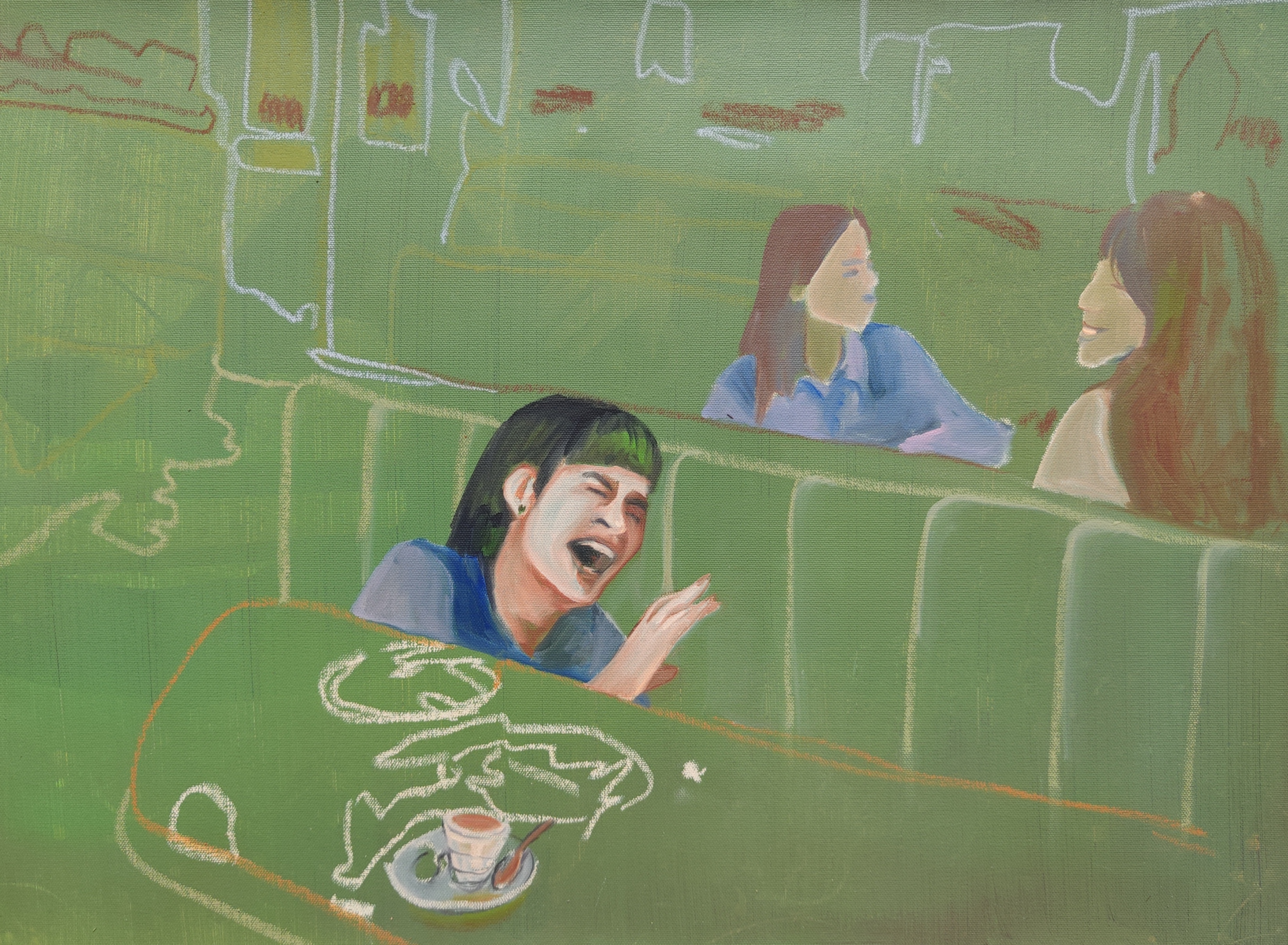 The composition is centered around a scene in a cafe or bar. The dominant color of the background and furniture is a rich, grassy green, which instantly catches the eye and creates a feeling of artificial lighting or the specific atmosphere of the establishment.