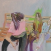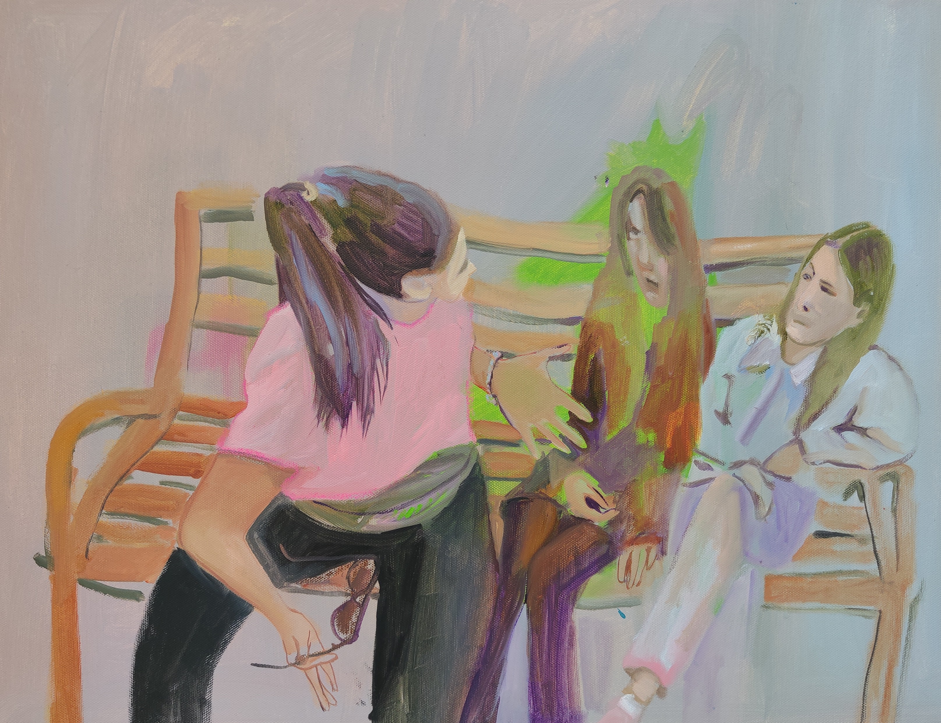 The composition is centered around three female figures sitting on a wooden bench. The bench, executed in warm ochre tones, serves as a common base for their interaction.