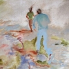 The foreground is dominated by a figure, depicted in free strokes of bluish-green clothing, with its back to the viewer. Its silhouette seems massive and focused. This figure seems to lead or attract attention to itself.