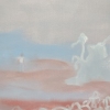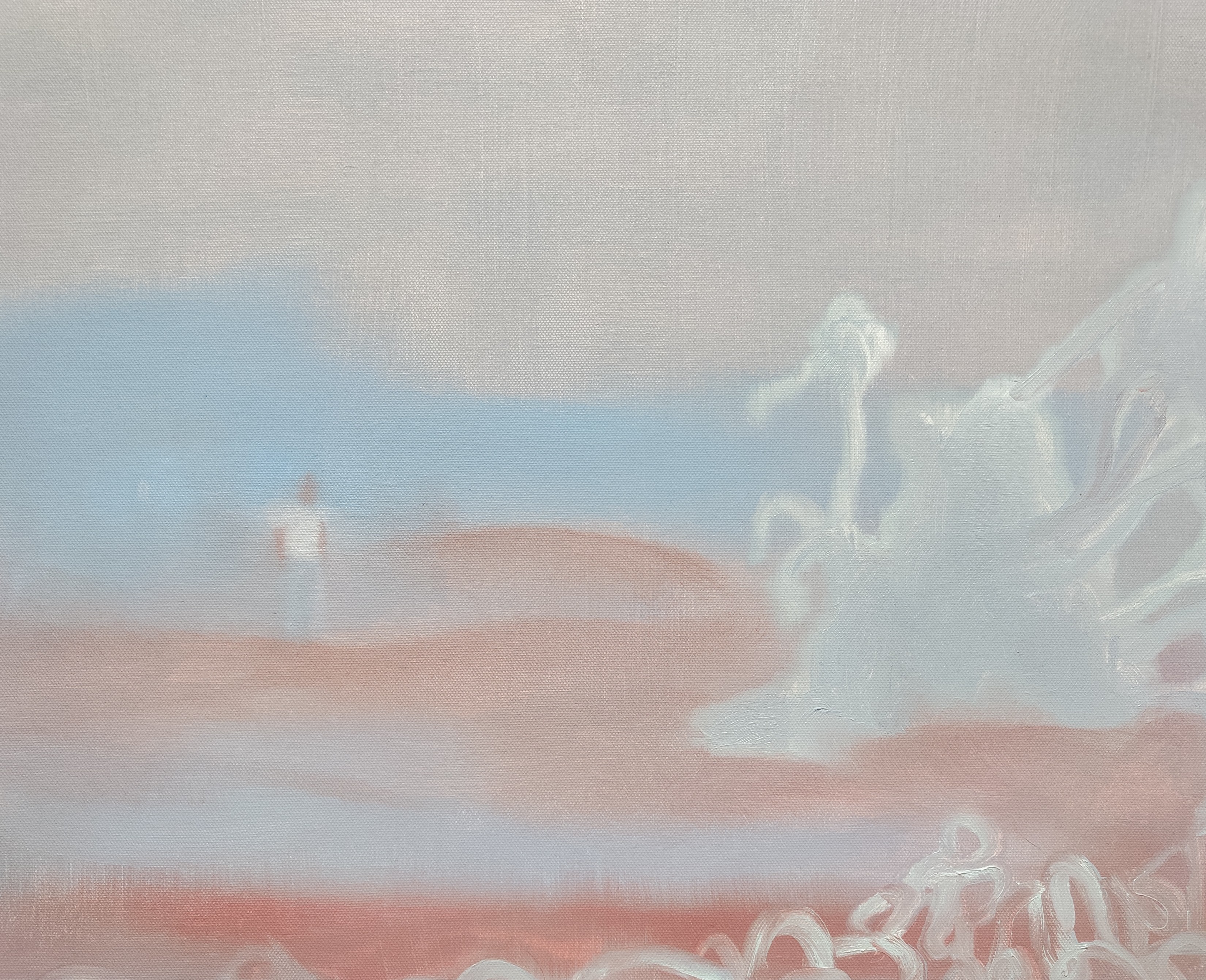 At the center of attention is a blurred, almost ghostly landscape, executed in soft shades of pink, blue, and white. The space seems shrouded in haze, which lends it a feeling of unreality and mystery. The horizon is slightly blurred, creating a sense of infinity and expanse.